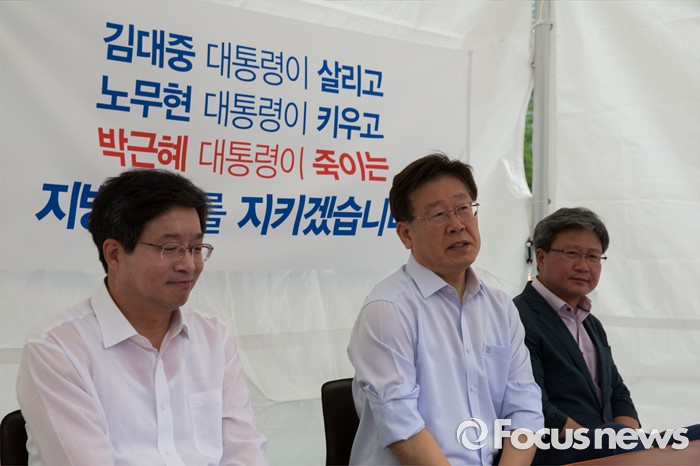(서울=포커스뉴스) 7일 오전 서울 종로구 광화문광장에서 염태영(왼쪽부터) 수원시장, 이재명 성남시장, 채인석 화성시장이 정부의 지방재정개편안에 반대하는 단식농성 기자회견을 마친 뒤 단식농성을 시작해 기자들의 질문을 받고 있다.