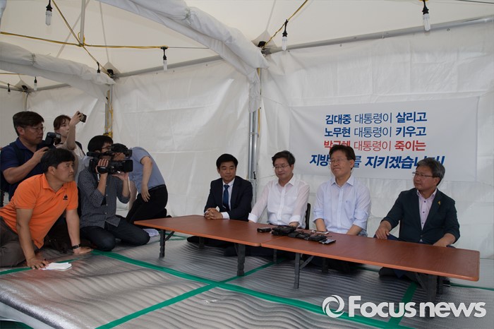 (서울=포커스뉴스) 7일 오전 서울 종로구 광화문광장에서 김병욱(왼쪽부터) 더불어민주당 의원(분당을), 염태영 수원시장, 이재명 성남시장, 채인석 화성시장이 정부의 지방재정개편안에 반대하는 단식농성 기자회견을 마친 뒤 단식농성을 시작해 기자들의 질문을 받고 있다.