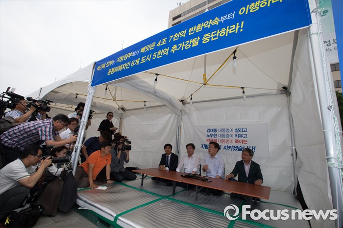 (서울=포커스뉴스) 7일 오전 서울 종로구 광화문광장에서 김병욱(왼쪽부터) 더불어민주당 의원(분당을), 염태영 수원시장, 이재명 성남시장, 채인석 화성시장이 정부의 지방재정개편안에 반대하는 단식농성 기자회견을 마친 뒤 단식농성을 시작해 기자들의 질문을 받고 있다.