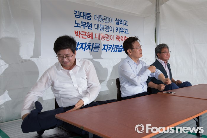 (서울=포커스뉴스) 7일 오전 서울 종로구 광화문광장에서 염태영(왼쪽부터) 수원시장, 이재명 성남시장, 채인석 화성시장이 정부의 지방재정개편안에 반대하는 단식농성 기자회견을 마친 뒤 단식농성을 시작하고 있다.