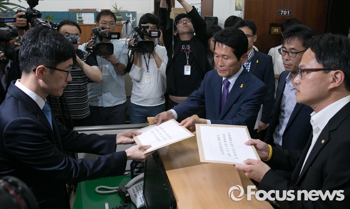 (서울=포커스뉴스) 박주민 더불어민주당 의원과 윤소하 정의당 의원, 전명선 4·16가족협의회 운영위원장, 유경근 집행위원장 등이 7일 오후 서울 여의도 국회 의안과에서 세월호 특별법 개정안 등을 제출하고 있다.