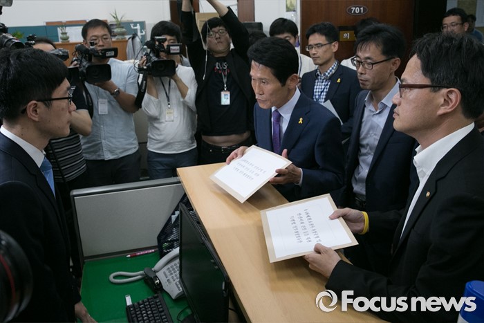 (서울=포커스뉴스) 박주민 더불어민주당 의원과 윤소하 정의당 의원, 전명선 4·16가족협의회 운영위원장, 유경근 집행위원장 등이 7일 오후 서울 여의도 국회 의안과에서 세월호 특별법 개정안 등을 제출하고 있다.