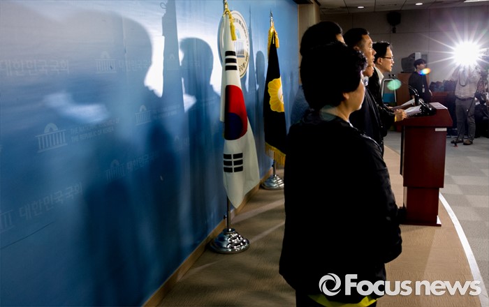 (서울=포커스뉴스) 박주민 더불어민주당 의원과 윤소하 정의당 의원, 전명선 4·16가족협의회 운영위원장, 유경근 집행위원장 등이 7일 오후 서울 여의도 국회 정론관에서 세월호 특별법 개정안 발의 기자회견을 하고 있다.