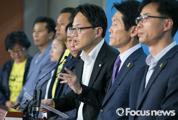(서울=포커스뉴스) 박주민 더불어민주당 의원과 윤소하 정의당 의원, 전명선 4·16가족협의회 운영위원장, 유경근 집행위원장 등이 7일 오후 서울 여의도 국회 정론관에서 세월호 특별법 개정안 발의 기자회견을 하고 있다.