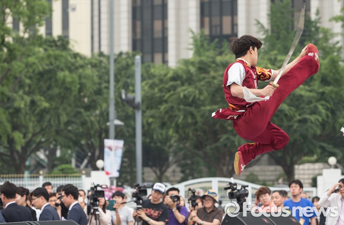 (서울=포커스뉴스) 7일 오후 서울 종로구 광화문 광장에서 열린 '2016 청주(충북) 세계무예마스터십 D-100성공기원행사'에 참여한 시범단이 우슈 동작을 선보이고 있다.