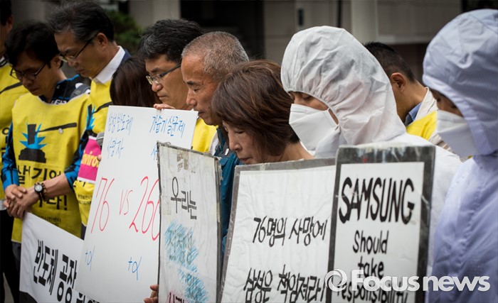 (서울=포커스뉴스) 7일 오후 서울 서초구 삼성전자 사옥 앞에서 열린 '반도체 공장 희생자들과 가습기살균제 피해자들 연대 기자회견'에서 가피모 및 반올림 회원들이 희생자들을 위한 묵념을 하고 있다.