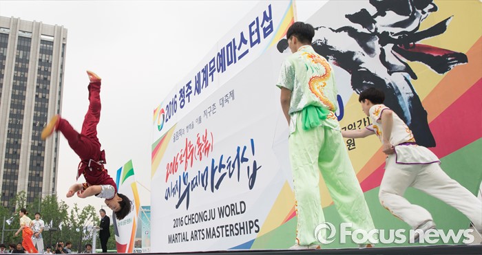 (서울=포커스뉴스) 7일 오후 서울 종로구 광화문 광장에서 열린 '2016 청주(충북) 세계무예마스터십 D-100성공기원행사'에 참여한 시범단이 우슈 동작을 선보이고 있다.