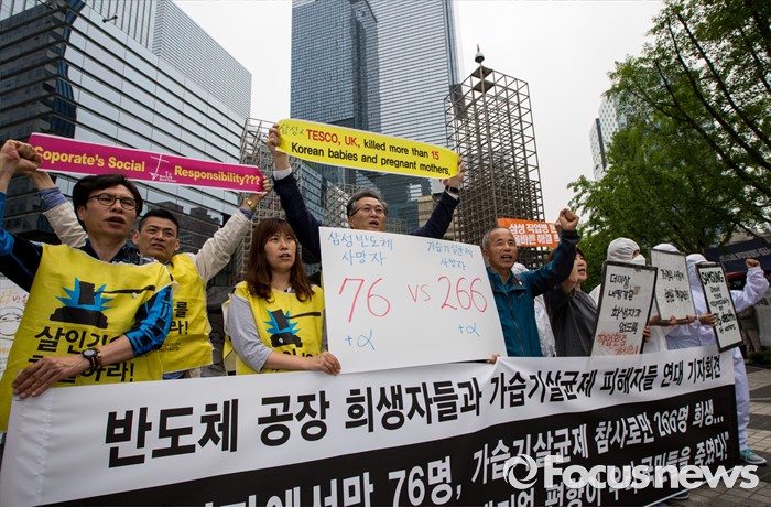 (서울=포커스뉴스) 7일 오후 서울 서초구 삼성전자 사옥 앞에서 열린 '반도체 공장 희생자들과 가습기살균제 피해자들 연대 기자회견'에서 가피모 및 반올림 회원들이 정부 및 기업의 책임을 촉구하는 구호를 외치고 있다.