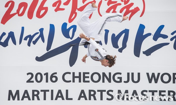 (서울=포커스뉴스) 7일 오후 서울 종로구 광화문 광장에서 열린 '2016 청주(충북) 세계무예마스터십 D-100성공기원행사'에 참여한 예원예술대학교 학생이 시범을 보이고 있다.