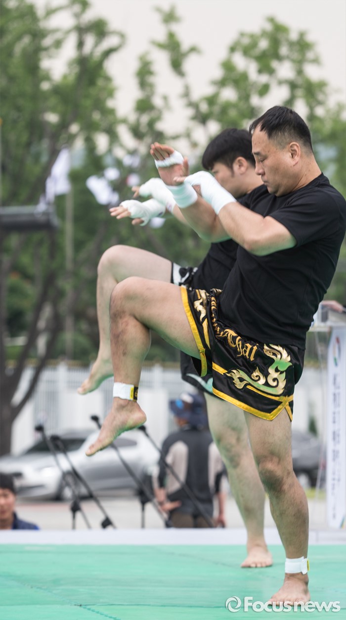 (서울=포커스뉴스) 7일 오후 서울 종로구 광화문 광장에서 열린 '2016 청주(충북) 세계무예마스터십 D-100성공기원행사'에 참여한 시범단이 무에타이를 소개하고 있다.
