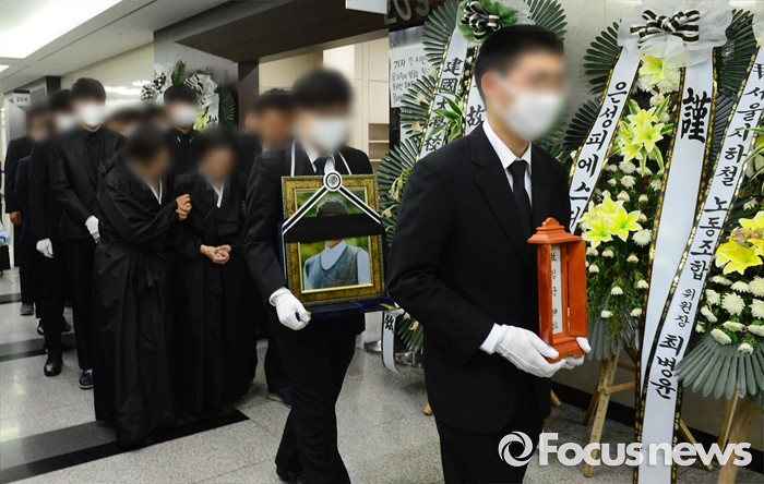 (서울=포커스뉴스) 서울 지하철 2호선 구의역에서 스크린도어를 정비하다가 숨진 김 모 군의 발인일인 9일 오전 서울 광진구 건국대학교병원 장례식장에서 유족들이 고인의 영정을 따르며 슬퍼하고 있다.