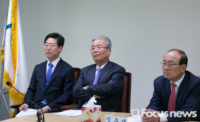 (서울=포커스뉴스) 8일 오전 서울 여의도 민주정책연구원에서 '건강보험 부과체계 개편 방안' 주제로 열린 사회경제포럼에 참석한 김종인(가운데) 더불어민주당 비대위 대표, 양승조(왼쪽) 의원, 김종대 정책위부의장이 이진석 서울대 의대 교수의 발제를 듣고 있다.