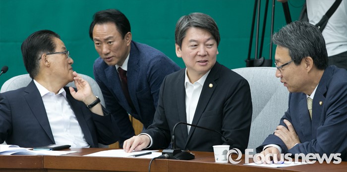 (서울=포커스뉴스) 9일 오전 서울 여의도 국회에서 국회 부의장 후보 선출을 위해 열린 국민의당 의원총회에 참석한 의원들이 대화하고 있다. 왼쪽부터 박지원 원내대표, 김명진 원내대표비서실장, 안철수 상임공동대표, 김성식 정책위의장.