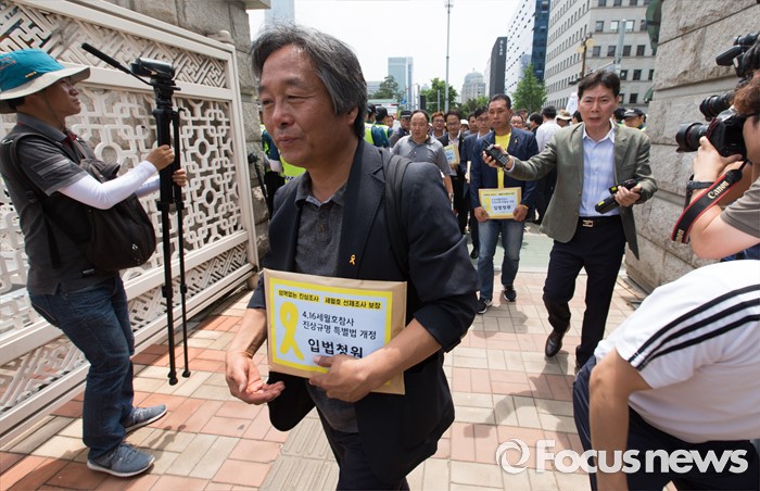 (서울=포커스뉴스) 8일 오전 서울 여의도 국회 앞에서 4.16가족협의회와 4.16연대 관계자들이 세월호 진상규명 특별법 개정 입법청원 기자회견 후 입법청원서를 들고 국회 본청 앞으로 향하고 있다.