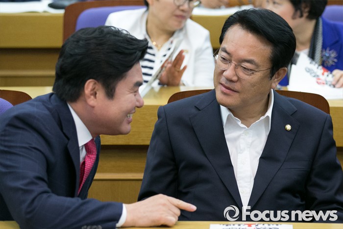 (서울=포커스뉴스) 8일 오전 서울 여의도 국회 의원회관에서 열린 국가미래전략포럼(일명 알파포럼) 창립총회 및 강연회에 참석한 정진석(오른쪽) 새누리당 원내대표와 원유철 전 원내대표가 대화하고 있다. 이날 정 원내대표와 서 전 최고위원은 국회의장직을 야당에 양보한다는 뜻을 밝혔다.