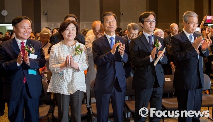 (서울=포커스뉴스) 10일 오전 서울 중구 프레스센터에서 열린 6.10 민주항쟁 제29주년 기념식에 참석한 김재원(왼쪽부터) 대통령실 정무수석, 심상정 정의당 대표, 천정배 국민의당 공동대표, 김영우 새누리당 비대위원, 김종인 더불어민주당 비대위 대표가 박수치고 있다.