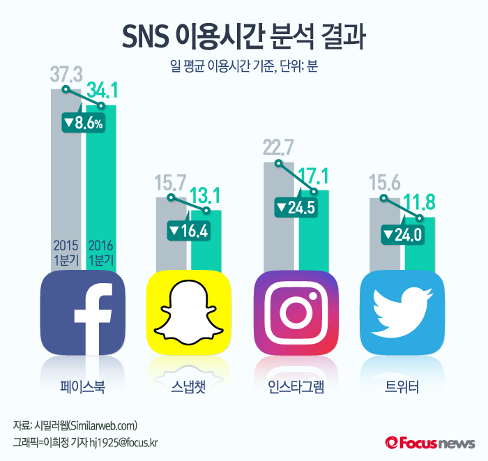 (서울=포커스뉴스) 2일 데이터 분석 업체 '시밀러웹(SimilarWeb)’의 4대 SNS 앱 이용시간 분석 결과에 따르면 페이스북, 인스타그램같이 공공성과 개방성이 강한 소셜네트워크서비스(SNS) 앱의 일 평균 이용시간이 감소한 것으로 나타났다. 일 평균 이용시간이 가장 많이 하락한 앱은 인스타그램으로 전년대비 24.5% 줄어들었다.