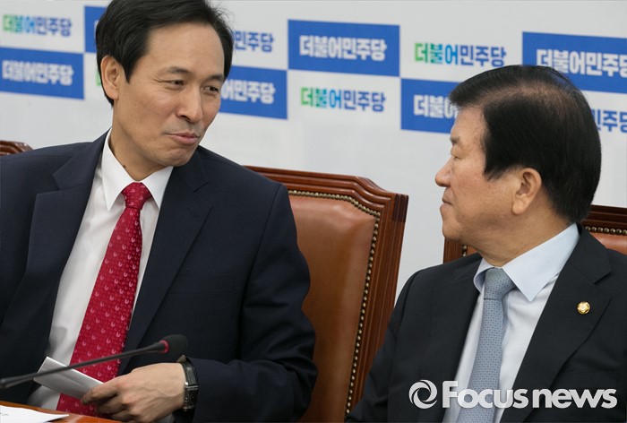 (서울=포커스뉴스) 9일 오전 서울 여의도 국회에서 열린 더불어민주당 가계부채TF, 현황 및 정부대책 보고에 참석한 우상호(왼쪽) 원내대표와 박병석 의원이 대화하고 있다.