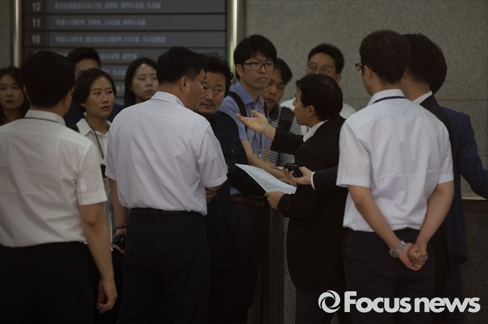 (서울=포커스뉴스) 8일 오전 서울 서초구 서울중앙지방검찰청에서 세월호 특조위 관계자들이 산케이신문 전 서울지국장 사건 관련 자료 확보를 위해 실지조사에 나서 검찰측과 실랑이를 벌이고 있다.