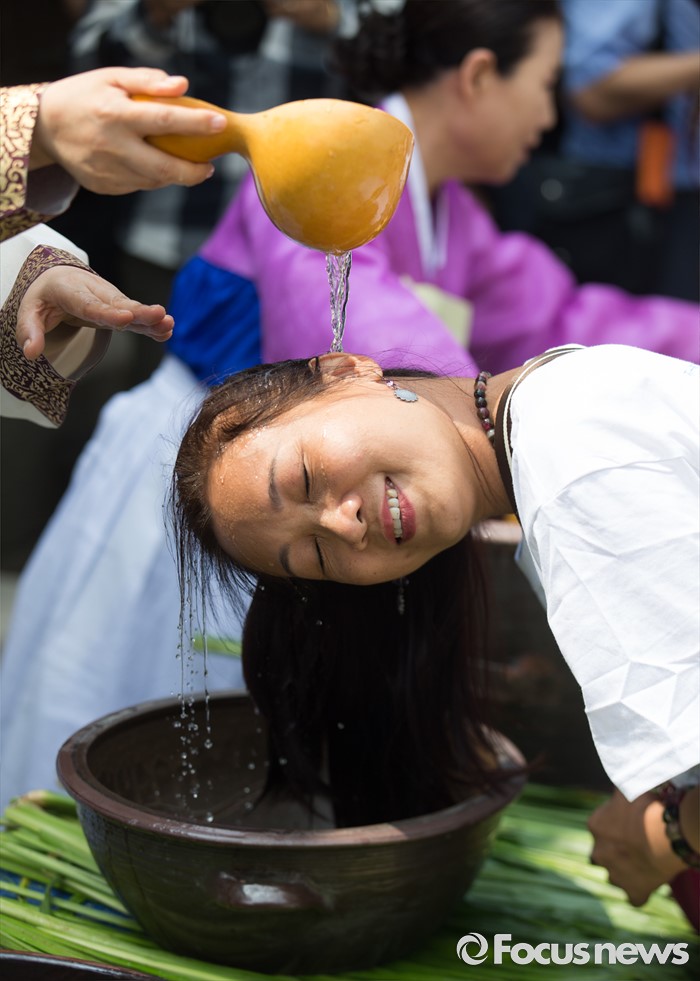 (서울=포커스뉴스) 9일 오후 단오 세시풍속을 체험하기 위해 서울 중구 남산 한옥마을을 방문한 중국 관광객이 창포물 머리감기 체험을 하고 있다.