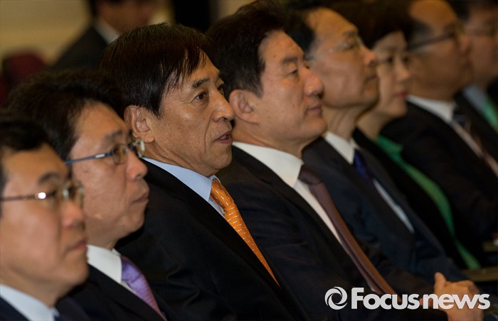 (서울=포커스뉴스) 10일 오전 서울 중구 한국은행 별관에서 열린 '한국은행 창립 66주년 기념식'에 참석한 이주열(왼쪽 세번째) 한은 총재가 자리에 앉아 있다.