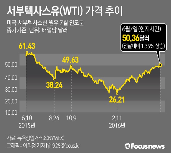 미국 외에 산유국들이 생산량을 늘릴 수 있다는 것도 위험변수다. 원유 가격이 오르면서 점유율을 잃지 않으려는 산유국들의 눈치 싸움이 일어날 수 있다.(서울=포커스뉴스) 7일(현지시간) 뉴욕상업거래소(NYMEX)에서 서부텍사스산원유(WTI) 가격은 전날보다 배럴당 0.67달러(1.35%) 상승한 50.36달러를 기록했다. 2016.06.08 이희정 기자