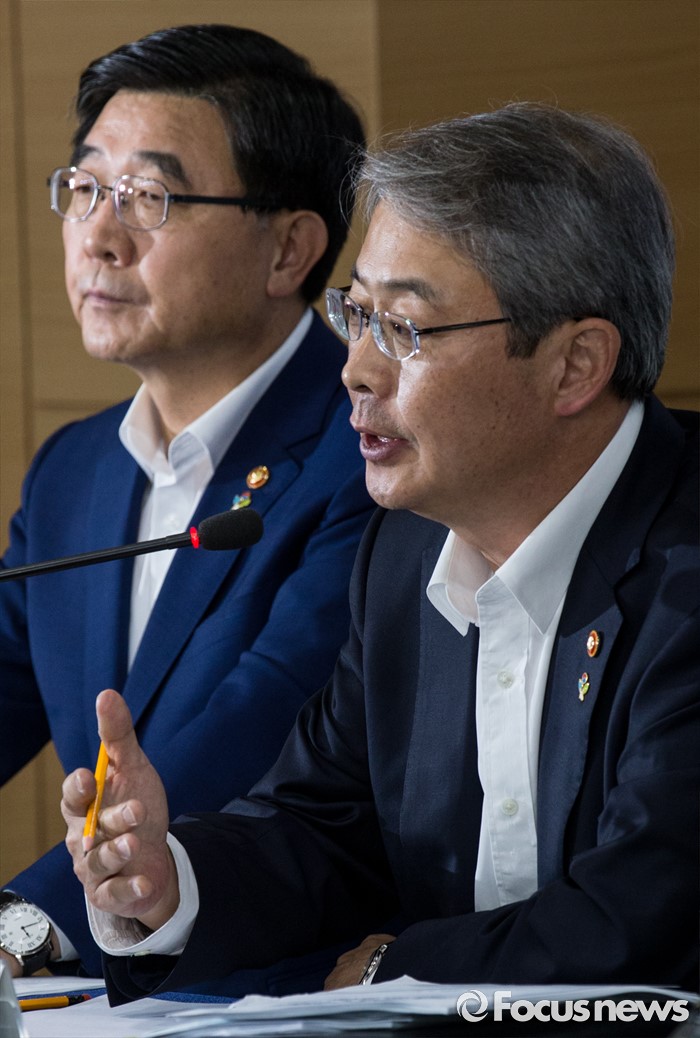 (서울=포커스뉴스) 8일 오전 서울 종로구 정부서울청사에서 임종룡(오른쪽) 금융위원장이 구조조정 추진현황 및 계획에 대해 발표하고 있다.