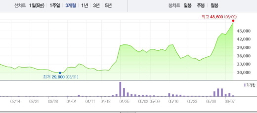 1달 전 주가인 5월9일(3만8300원)과 비교하면 25.06% 상승한 수치다.