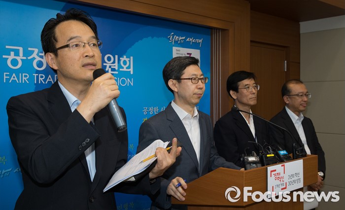 (세종=포커스뉴스) 박춘호 기획재정부 법인세제과장이 8일 오전 세종시 정부세종청사 공정위 기자실에서 대기업집단 지정제도 개선방안에 대한 브리핑 중에 취재진의 질문에 답변하고 있다. 왼쪽부터 박춘호 기획재정부 법인세제과장, 신영선 사무총장, 김병근 중소기업청 중소기업정책국장, 원동진 산업통상자원부 산업정책관.