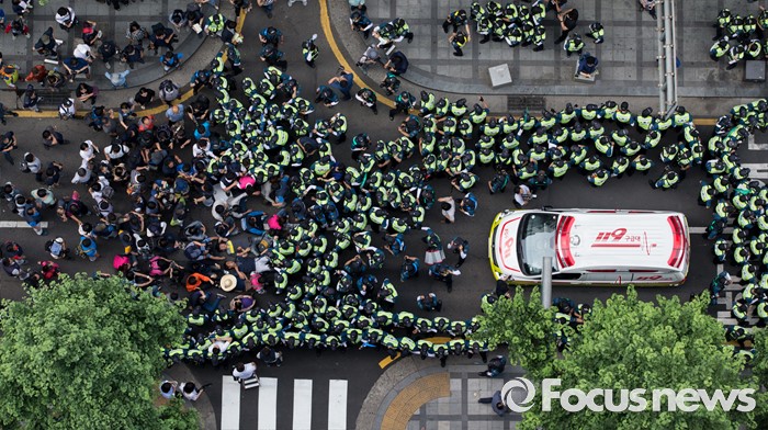 (서울=포커스뉴스) 사내하청 전원 정규직화를 요구하며 고공농성을 벌여온 기아자동차 사내하청 노동자 최정명씨와 한규협씨가 농성을 해제한 8일 오후 서울 중구 옛 국가인권위원회 건물 옥상 광고탑 농성장에서 내려와 병원으로 이동하던 중 경찰과 노조원들이 실랑이를 벌이고 있다.