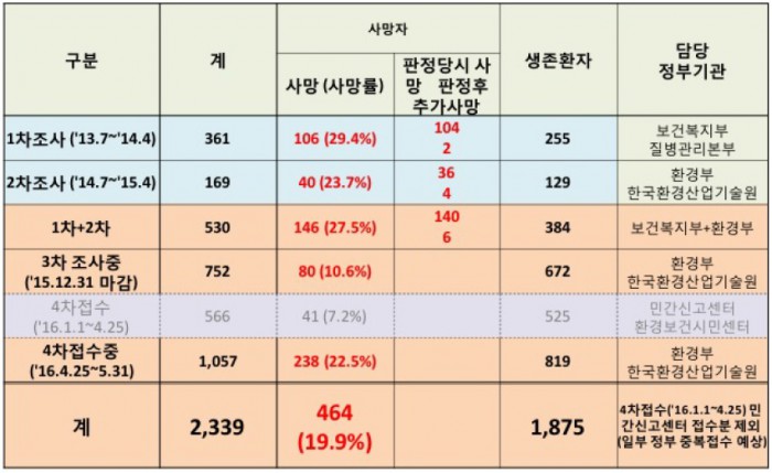 이로써 지금까지 접수된 전체 피해자 수는 총 2339명(사망자 464명, 생존환자 1875명)이다. 피해신고자의 19.9%가 사망자로 신고자 10명 중 2명이 목숨을 잃은 셈이다.