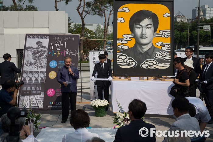 (서울=포커스뉴스) 9일 오후 서울 서대문구 연세대학교 정문 앞에서 열린 '제29주기 이한열 열사 동판 제막식에 참석한 고인의 쓰러지는 모습을 카메라에 담았던 전 로이터 통신 정태원 사진기자가 인사말을 하고 있다.