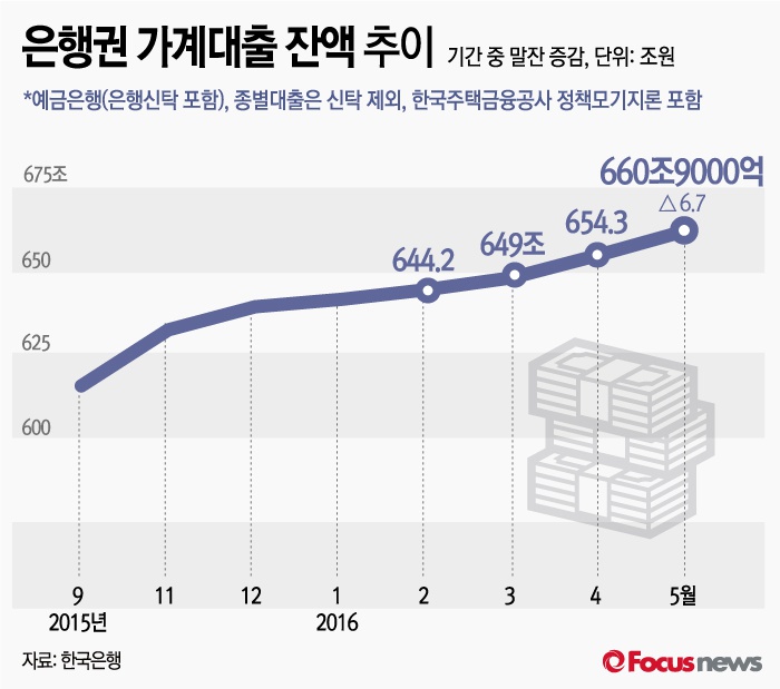 8일 한국은행이 공개한 '2016년 5월 중 금융시장 동향'을 살펴보면 올 5월 은행권 가계대출(정책모기지론 포함) 잔액은 6조7000억원 늘어난 660조9000억원으로 집계됐다. 가계대출 증가액은 전월 5조2000억원보다 크고 지난 2010∼2014년 5월 평균 3조원보다도 부쩍 늘어난 것으로 파악됐다.