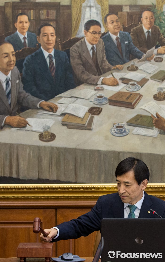 (서울=포커스뉴스) 9일 오전 서울 중구 남대문로 한국은행 본관에서 열린 금융통화위원회 본회의에 참석한 이주열 한국은행 총재가 개회를 알리는 의사봉을 두드리고 있다.