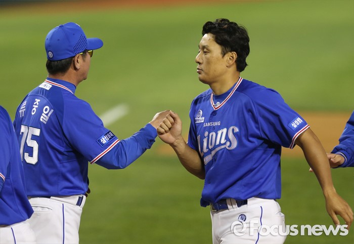 (서울=포커스뉴스) 7일 서울 잠실구장에서 열린 2016 프로야구 삼성-LG 경기에서 8회 8득점으로 역전승한 삼성 류중일 감독이 이승엽과 주먹을 마주치고 있다.