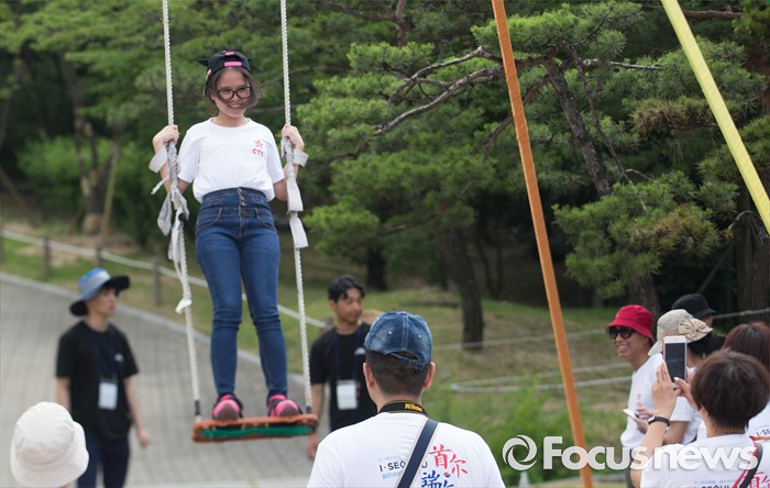 (서울=포커스뉴스) 9일 오후 단오 세시풍속을 체험하기 위해 서울 중구 남산 한옥마을을 방문한 중국 관광객들이 그네타기 체험을 하고 있다.