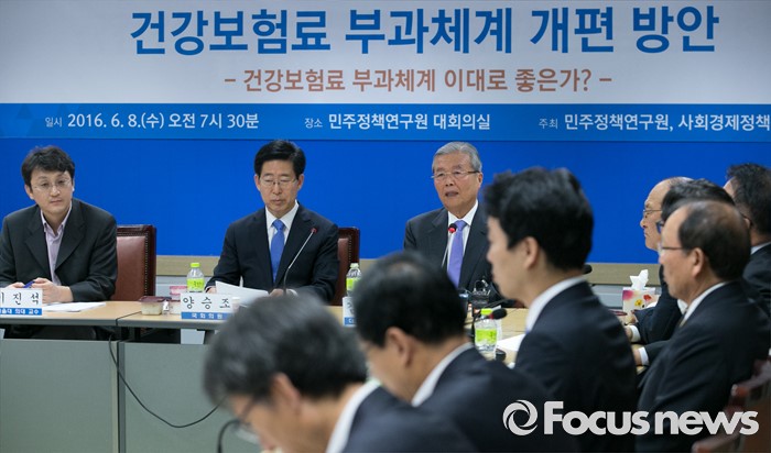 (서울=포커스뉴스) 8일 오전 서울 여의도 민주정책연구원에서 '건강보험 부과체계 개편 방안' 주제로 열린 사회경제포럼에 참석한 김종인 더불어민주당 비대위 대표가 인사말을 하고 있다. 왼쪽부터 이진석 서울대 의대 교수, 양승조 의원, 김 대표.