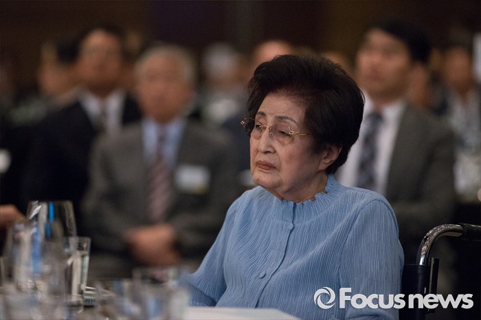 (서울=포커스뉴스) 9일 오후 서울 여의도구 63빌딩 그랜드볼룸에서 열린 '6.15 남북정상회담 16주년 기념식'에 이희호 여사가 참석하고 있다.