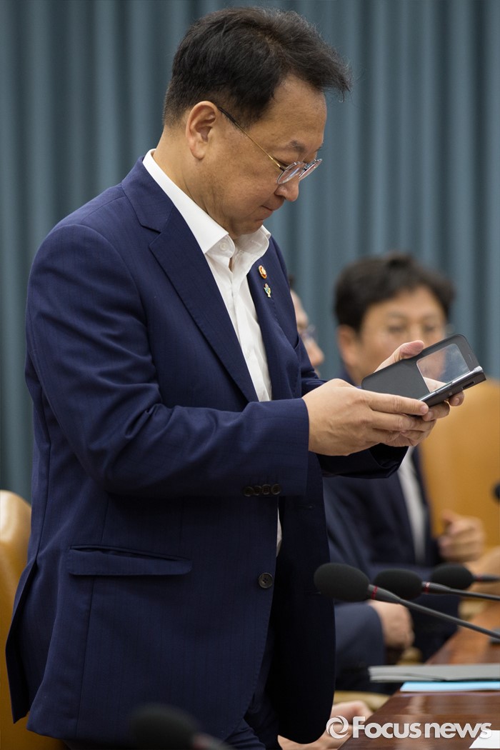 (서울=포커스뉴스) 9일 서울 종로구 정부서울청사에서 열린 제 8차 경제관계장관회의에서 유일호 부총리 겸 기획재정부 장관이 들어서며 휴대폰을 보고 있다.