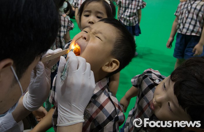 (대전=포커스뉴스) 9일 오전 구강보건의 날을 맞아 대전치과의사회 소속 치과의사들이 대전 서구 대전과학기술대학교에서 어린이집과 유치원 아동 5000여 명을 대상으로 무료 구강검진을 하고 있다.