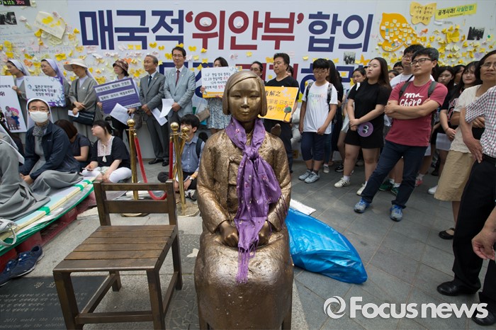 (서울=포커스뉴스) 8일 오후 서울 종로구 옛 일본대사관 앞에서 열린 제 1234차 일본군 위안부 문제해결을 위한 정기 수요시위에서 참가자들이 소녀상 주위로 모여 있다.