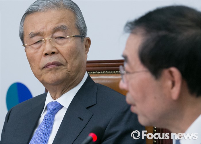 (서울=포커스뉴스) 8일 오전 서울 여의도 국회에서 구의역 스크린도어 노동자 사망 사건과 관련해 열린 더불어민주당-서울시 정책간담회에 참석한 김종인(왼쪽) 비대위 대표가 박원순 서울시장의 발언을 듣고 있다.