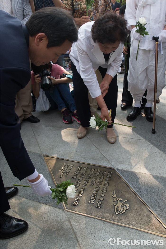 (서울=포커스뉴스) 9일 오후 서울 서대문구 연세대학교 정문 앞에서 열린 '제29주기 이한열 열사 동판 제막식에 참석한 더불어민주당 우상호(왼쪽) 의원과 배은심 이한열 열사의 어머니가 동판에 헌화하고 있다.