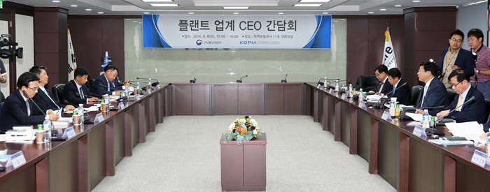 (서울=포커스뉴스) 주형환 산업통상자원부 장관이 8일 오후 서울 무역보험공사 대회의실에서 플랜트 업계 CEO 간담회를 주재하고 있다. 이날 간담회에는 최광철 플랜트협회장(SK건설 대표), 임병용 GS건설 대표, 박증흠 삼성엔지니어링 대표, 박정환 포스코엔지니어링 대표, 최광호 한화건설 대표, 정수현 현대건설 대표, 강영국 대림산업 대표, 홍기표 대우건설 부사장, 김헌탁 두산중공업 부사장, 조용두 포스코건설 본부장, 김영학 무역보험공사 사장, 최성환 수출입은행 부행장, 염동관 플랜트산업협회 부회장이 참석했다. <사진제공=산업통상자원부>