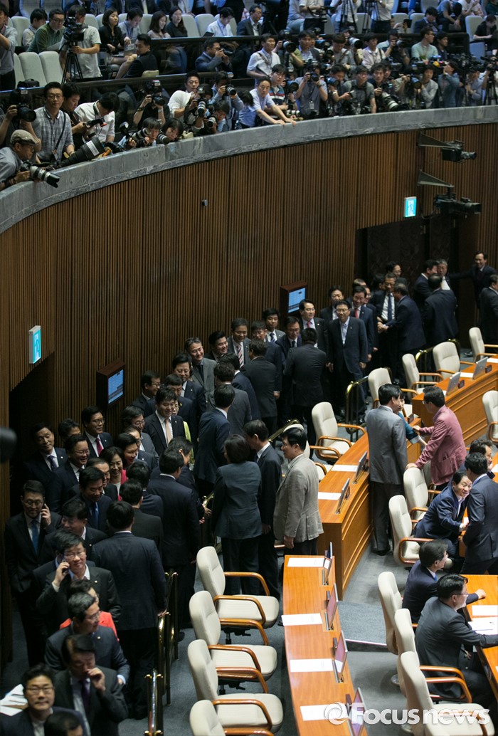 (서울=포커스뉴스) 9일 오후 서울 여의도 국회에서 열린 20대 국회 첫 본회의에 참석한 의원들이 국회의장 후보 선출 투표를 위해 줄을 서서 기다리고 있다. 이날 20대 국회 전반기 국회의장으로 정세균 더불어민주당 의원이 공식 선출됐다.