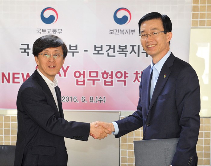 (서울=포커스뉴스) 김경환(왼쪽) 국토교통부 차관과 방문규 보건복지부 차관이 8일서울 대한주택보증공사에서 뉴스테이 단지내 국공립어린이집 유치 추진 협약을 체결하고 있다. <사진제공=국토교통부>