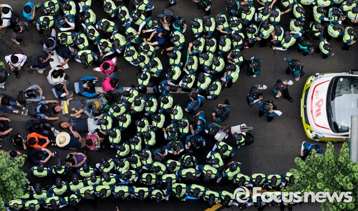 (서울=포커스뉴스) 사내하청 전원 정규직화를 요구하며 고공농성을 벌여온 기아자동차 사내하청 노동자 최정명씨와 한규협씨가 농성을 해제한 8일 오후 서울 중구 옛 국가인권위원회 건물 옥상 광고탑 농성장에서 내려와 병원으로 이동하던 중 경찰과 노조원들이 실랑이를 벌이고 있다.