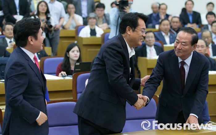 (서울=포커스뉴스) 8일 오전 서울 여의도 국회 의원회관에서 열린 국가미래전략포럼(일명 알파포럼) 창립총회 및 강연회에 참석한 정진석(가운데) 새누리당 원내대표와 서청원(오른쪽) 전 최고위원이 악수하고 있다. 왼쪽은 원유철 전 원내대표. 이날 정 원내대표와 서 전 최고위원은 국회의장직을 야당에 양보한다는 뜻을 밝혔다.