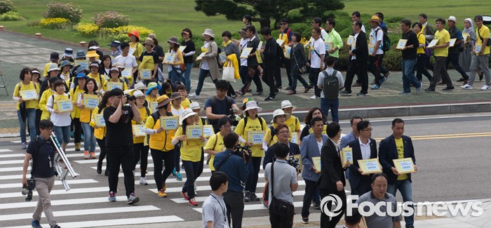 (서울=포커스뉴스) 8일 오전 서울 여의도 국회 앞에서 4.16가족협의회와 4.16연대 관계자들이 세월호 진상규명 특별법 개정 입법청원 기자회견 후 입법청원서를 들고 국회 본청 앞으로 향하고 있다.