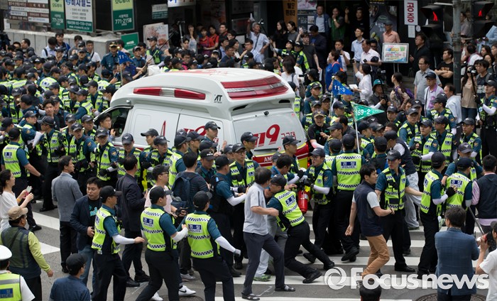 (서울=포커스뉴스) 사내하청 전원 정규직화를 요구하며 고공농성을 벌여온 기아자동차 사내하청 노동자 최정명씨와 한규협씨가 농성을 해제한 8일 오후 서울 중구 옛 국가인권위원회 건물 옥상 광고탑 농성장에서 내려와 병원으로 이동하던 중 경찰과 노조원들이 실랑이를 벌이고 있다.